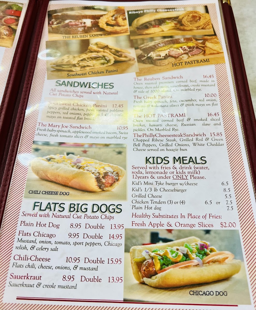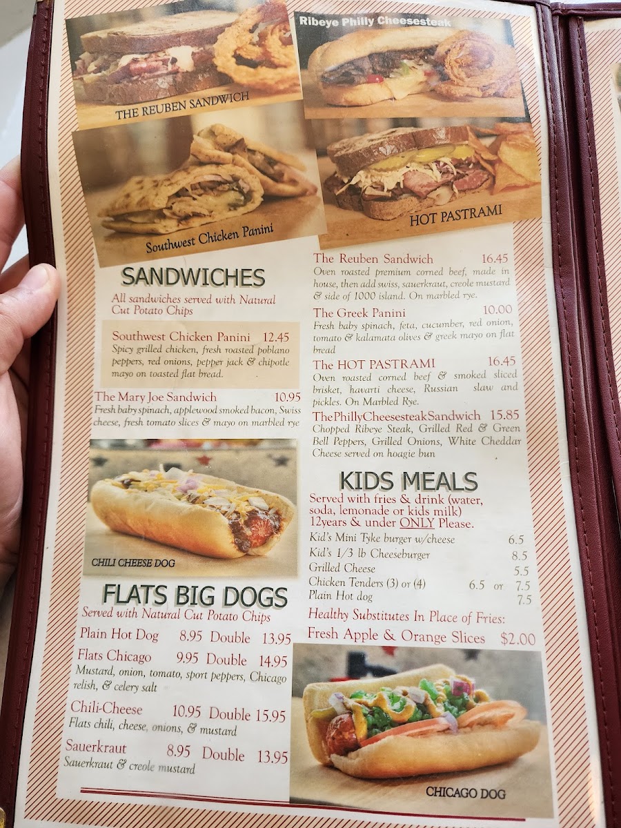 1/2 lb with the works, cheddar, and Flats Signature Sauce: Made from huge amounts of fresh garlic & onions with six types of fresh peppers and spices. Roasted, then Caramelized to perfection!