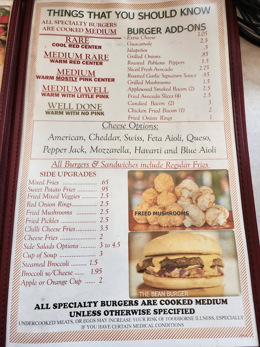 2/3 lb stuffed burger of choice, no bun. Served with fresh cut & grilled zucchini, mushrooms, red onions, broccoli, red & green bell peppers and jalapeños & Texas Toast